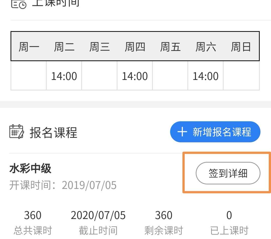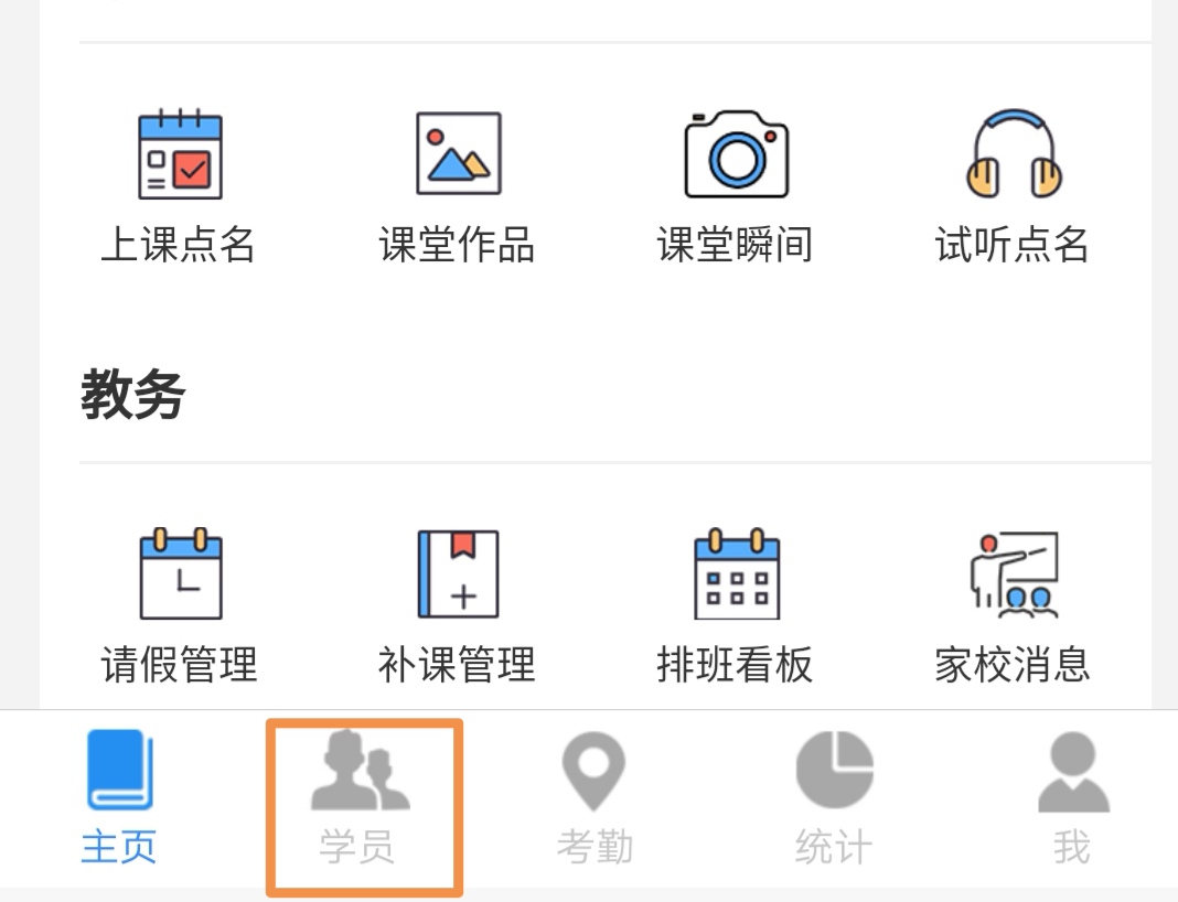 在小程序首页进入“学员”(当天有排课的学员可不进入“学员”里搜索,直接进入到所在班级点开该学员头像,再进入“签到详细”)。