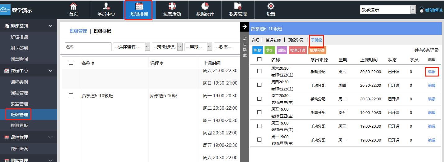 单个子班级开停课:在“班级排课”里进入“班级管理”,点开需要停课或开课的班级后进入“子班级”,再进入需要开课或停课班级后的“编辑”,在状态后选“停课”(需要停课)或选择“已开课”(需开课)后提交。