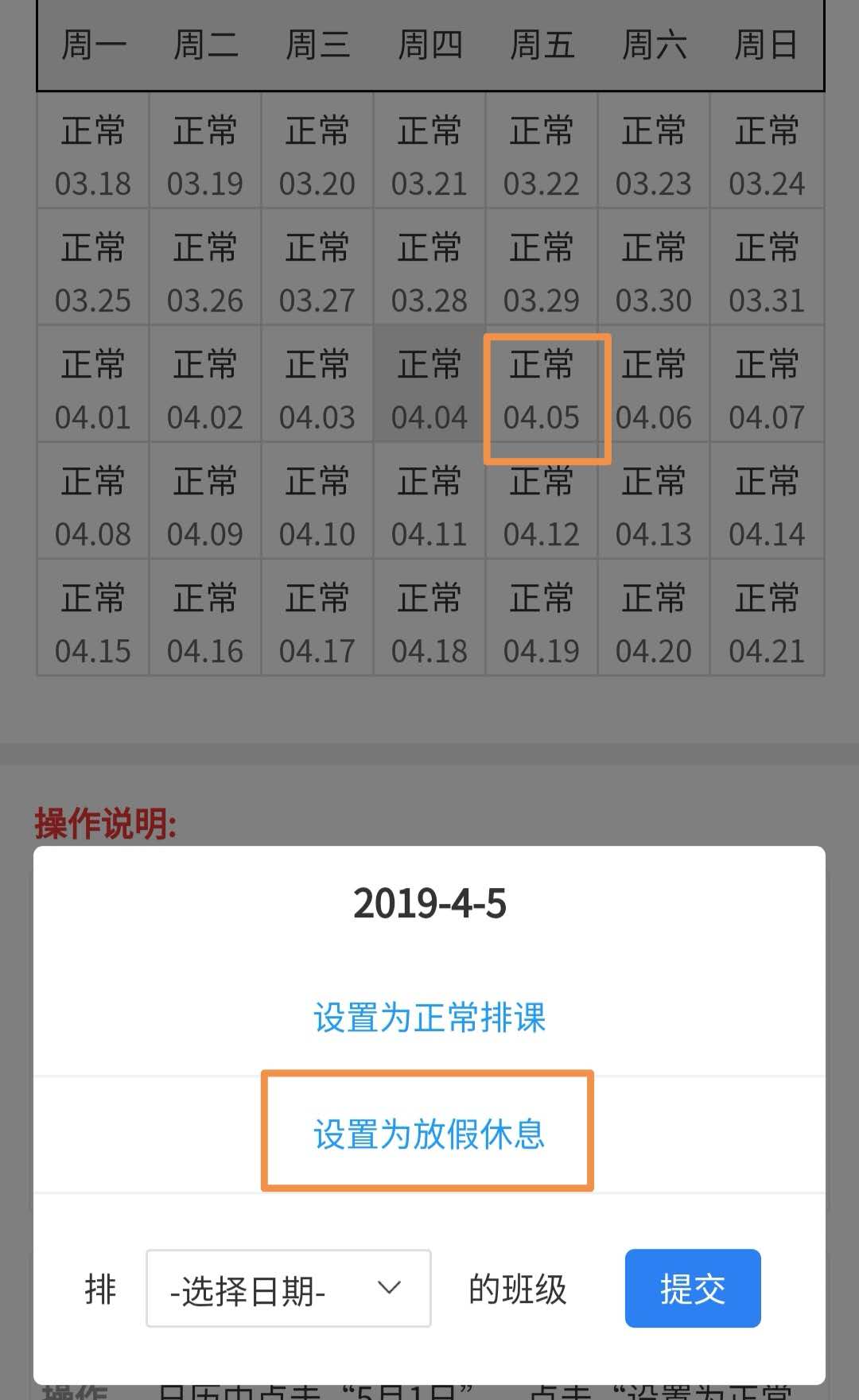第2步:在日历里选择调至上课的日期,再进入弹框里选择需要调课的日期(如5月1日的课调到4月30日,日历中点击“04月30日”,调课日期选择“05月1日”;(注:若4月30号有排课,调课后将被5月1日的课覆盖),再进入“提交”。