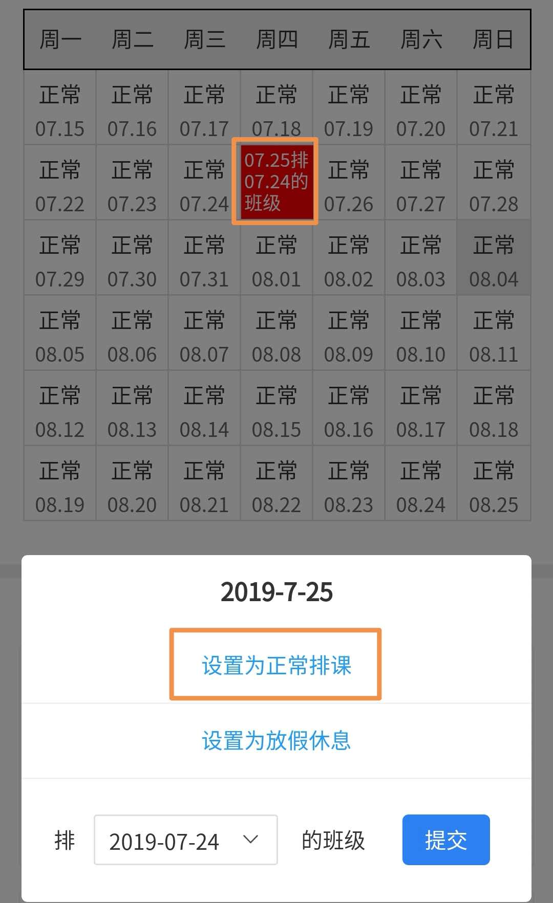 在“排班看板”里进入“放假/调课”,在日历里点击调课当天日期,再进入弹框里的“设置为正常排课”后确认。