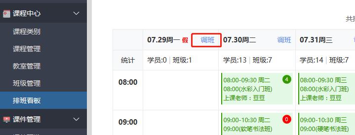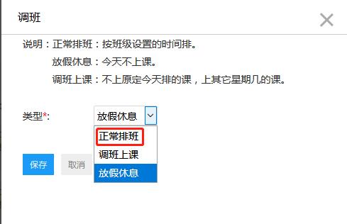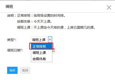 在“排班看板”里进入调课当天日期后的“调课”,选择类型为“正常排班”后进入“保存”
