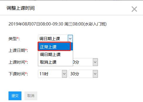 在“排班看板”里进入被调课班级,再选择类型为“正常上课”后进入“提交”。