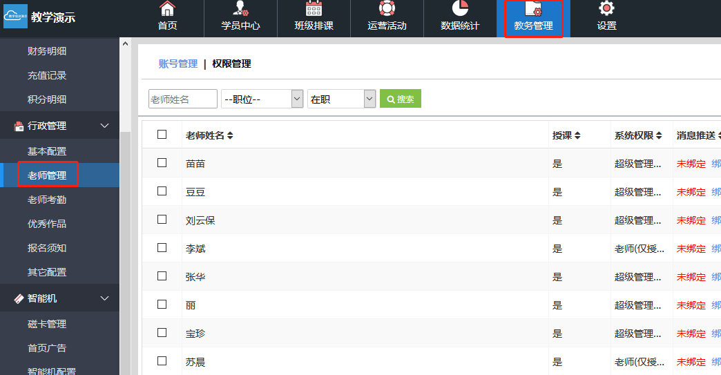 授课老师和管理老师职位必须分配班级后,在小程序端口里才可以看到和管理此班级(不分配班级小程序端口不会显示任何班级);超级管理员和前台老师职位可以不分配班级就可以看到和管理整个校区的所有班级(分配后名单会体现在班级里的“上课老师”里)。