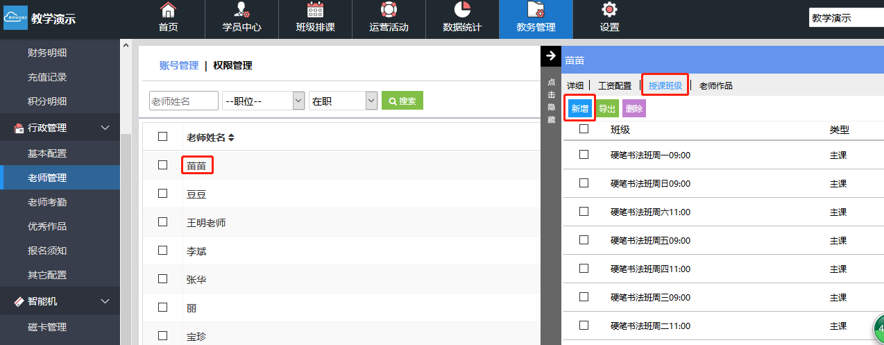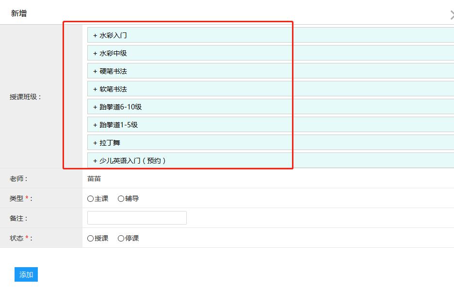 点开老师进入弹框里的“授课班级”,再进入“新增”。